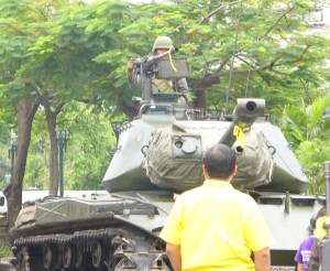 My motorcycle taxi makes a left toward the parliament house and we are halted by a blockade consisting of three large tanks and about 30 reporters carrying camera equipment – connecting them to their relative part of the world. The crank and clank of the tanks seem to be drawing in a small crowd, while repelling others who are too timid to close in on the fully operational steel monsters that have absorbed the avenue with the sound of their engines. The tanks form a gigantic wall, preventing the citizens from having any say in the decisions the active military junta will face over the next few days. I offer the motorcycle taxi the fee we previously agreed upon, and make my way toward the people clamoring about beneath the tanks.
