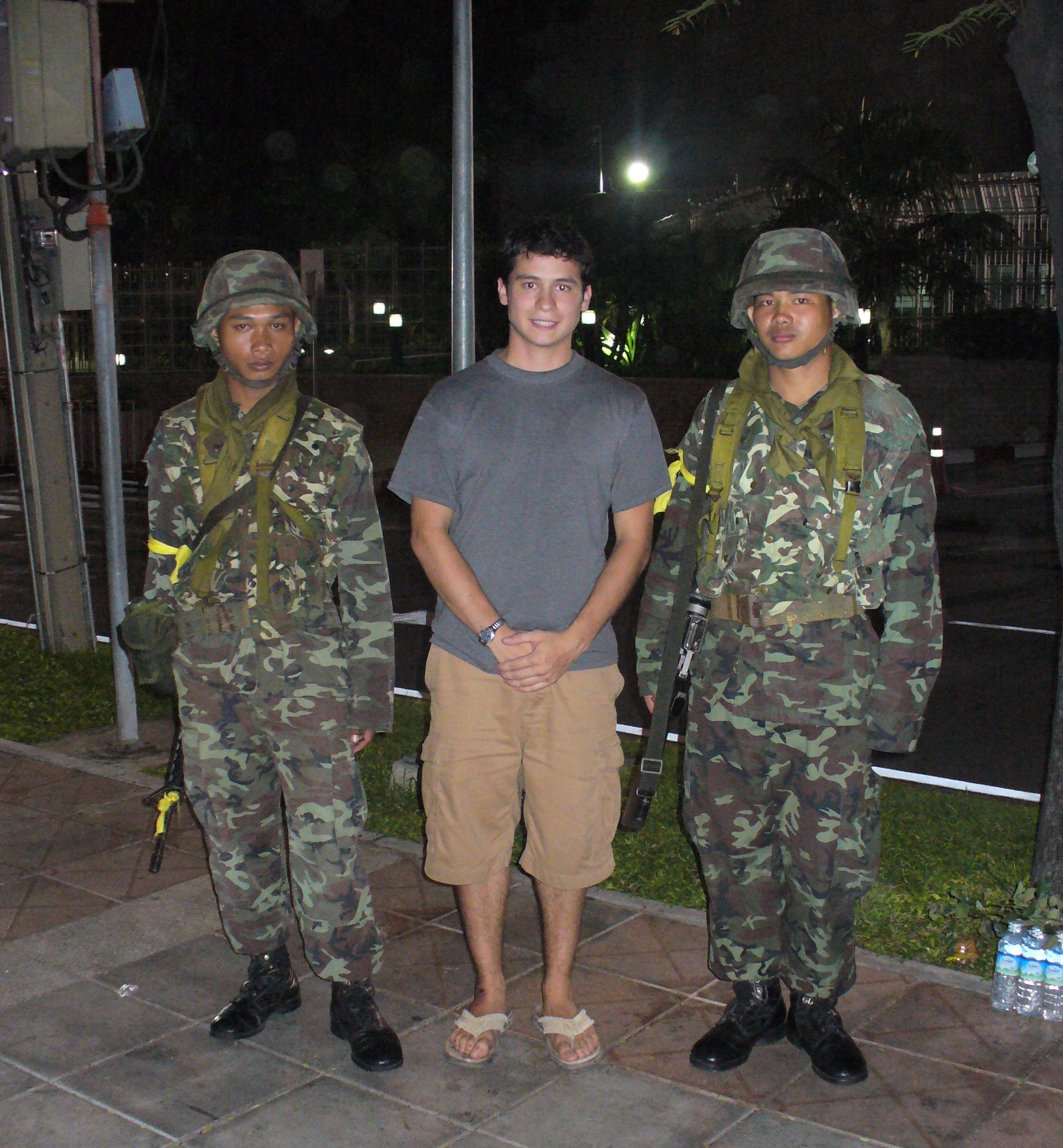 The turret mounted hummers and large green military transportation trucks seem extremely out of place in the middle of one of the busiest tourist sections of Bangkok. I look on towards the chaos in bewilderment as a tall white man approaches me.