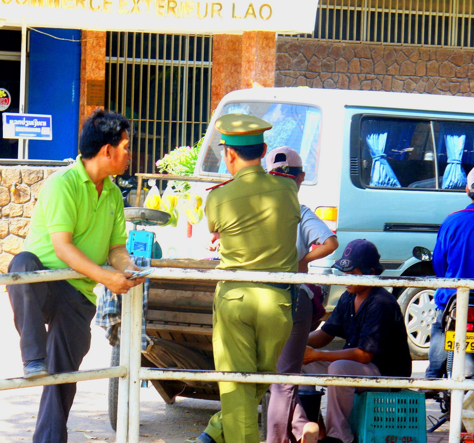 The sun slowly begins to make slow silhouettes out of two children playing beneath the red sky on the Mekong River. To the Laos (pronounced Lao by the locals) side of the river there is a large sand bar which swells the shallow stream of water. On the side which divides Laos from Thailand, a small mountain climbs into the sky perfectly to shadow most of Vientiane at dusk. A policeman in green Communist style fatigues stands by the only international ATM in the country offering that omnipresent sense of law. One block from my window, five Lao tuk-tuk (a 3-wheeled cabin cycle commonly found in Asia) drivers crack open their nightly beer on the side of the road. They are standing in the same place they were last night openly toward the small crowd that passes down the long drive that borders the waterfront; eagerly breaking their conversation to offer their services.