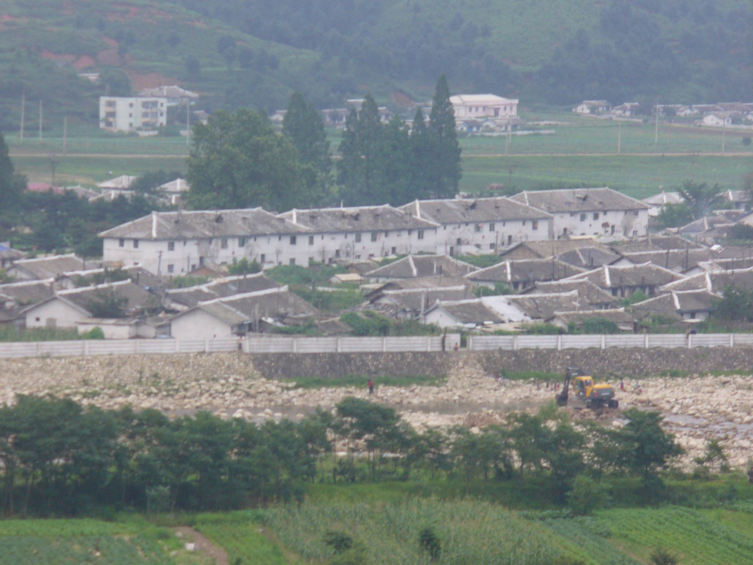 While most landscapes in South Korea seem to roll – in North Korea they tend to zig-zag. Spiky spires of these peaks shadow the tiny gray and black communes situated at the base surrounded by unbroken acres of farmland. There are tank shelters built into the sides of the mountains facing the road and ready to go, assuming that the North Koreans have regularly fueled them since the armistice some 50 years ago. The gray homes are cracked and crippled by years of neglect. Outside the bus window, farmers toil in the field, ever so often glancing up at a particular piece of motivating propaganda that centers their commune. Two girls look up at the bus and wave happily at tourists. Their clothing is colorful and doesn’t seem to be too controlled.
