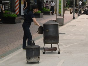 In Taipei it is a common sight to see small rusty iron crates that resemble garbage cans along the side of the road. Do not throw your garbage there. At first it may appear that people are burning some trash or old office documents, but don’t be misguided. Stacks of gold parchment found in supermarkets and local stores are commonly burnt on the street. These coarse pieces of cardboard-like paper are driven by the handful into fire to release good fortune. They are generally manufactured in local temples, where monks stamp the paper with different designs laced in gold. They are placed in front of businesses and homes, and there is never a bad time to make an offering of this smoky-sort.