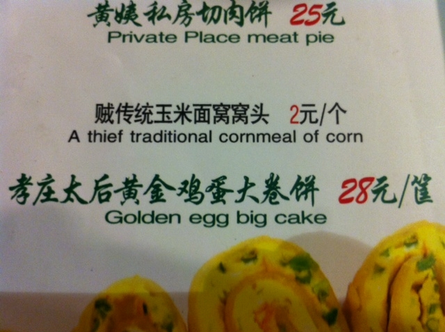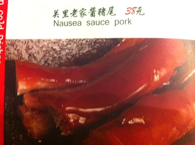 Before making my grand exit out of Shanghai, I decided it was more than necessary to revisit The Manchurian, or Dongbei Ren (东北人), a chain of atavistic eateries that perfume a potent Mao-era ambiance. While I love the nostalgic decor and variety of northeastern dishes (the medley of fried mushrooms comes to mind), the real reason why I wanted to return before I left was to scoop up some photos of the error-laden English-Chinese menu that greets every guest — what appears to me as an obvious Baidu/Google translator goof up.