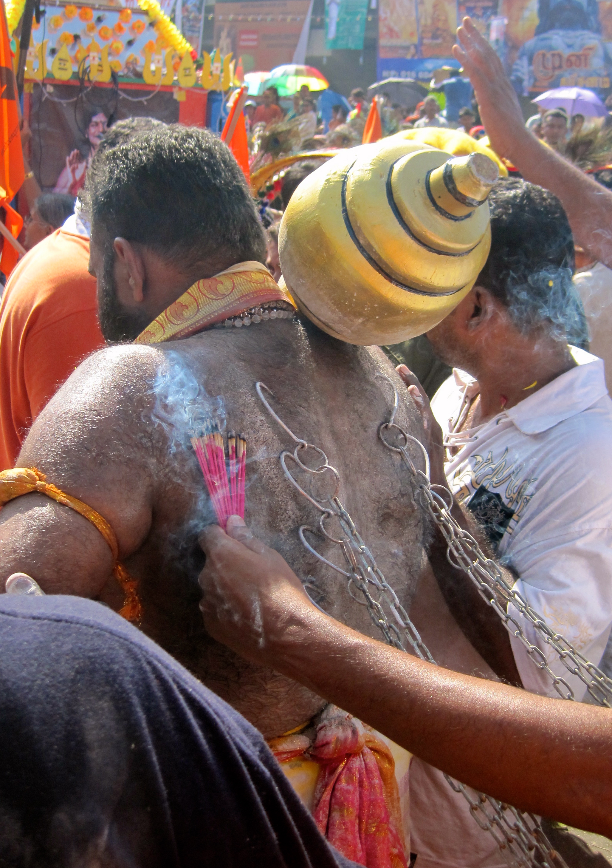 The smell of acrid incense hangs heavily in the air. Indeed, some devotees are being flagellated with lit sticks as they advance in a somnambulistic daze under constant assault from the oppressive sun. After entering the fray, I move forward, tailing worshippers banging drums to a hypnotically melodic tempo. Without music, a Malaysian Indian colleague had informed me, their trance would be broken. To add to the hysteria, the monotonous droning of the drums occasionally gets lost in the air by competing stalls pumping Top 10 Hits like carnival game booths vying for attention. Amid the cacophony there is a certain festive atmosphere that disguises the otherwise shocking display of punctured flesh with the high spirits of a sporting event. Worshippers are visibly amused; there are food stalls selling snacks, plenty of places to rehydrate (water is offered to devotees for free) and even a booth advertising Air Asia tickets. The path to the staircase is already littered with trash of the thousands who have passed before me.