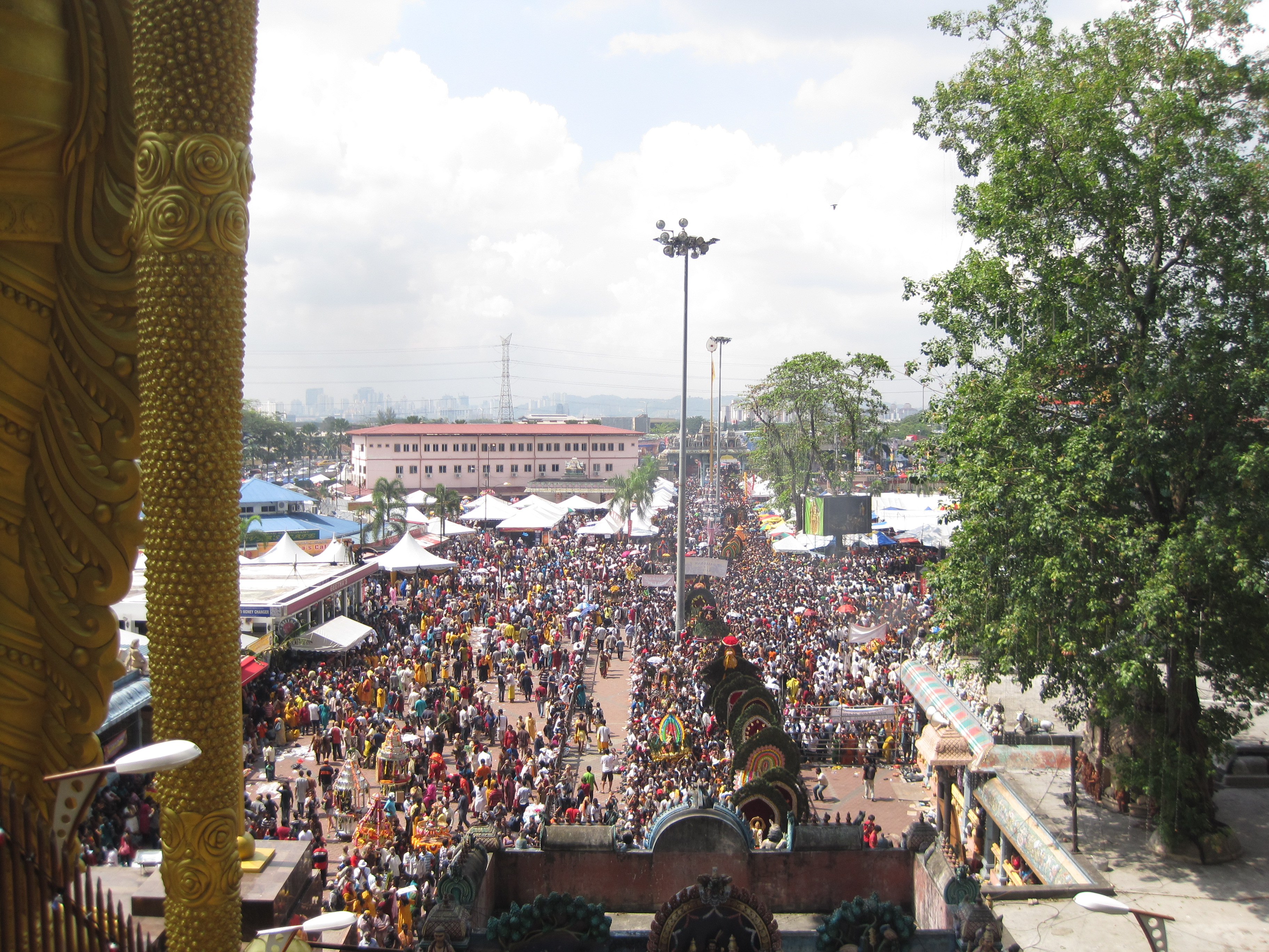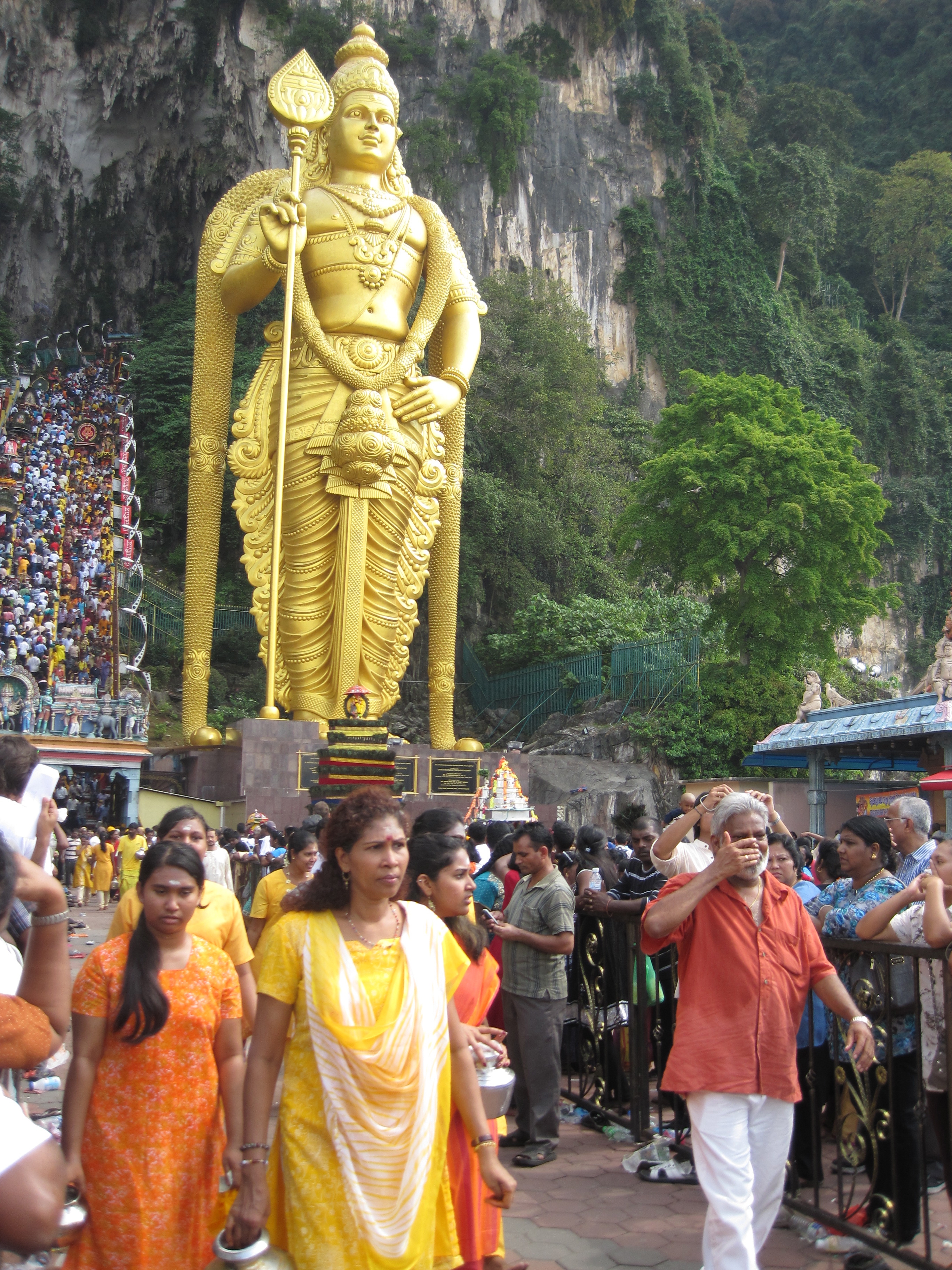 Starting from before dawn, the precession needles through Kuala Lumpur; it’s already 10am by the time I reach the first gateway, and a mob of local and foreigner onlookers numbering in the thousands congests the narrow pathway that leads up to the 272-step staircase at the base of the limestone caves. From afar, the peacock feathers adorning the top of kavadis seem to bob in the crowd like dark lime green shuttlecocks caught in the current of a shadowy sea. Next to the staircase, a 42.7 meter golden statue of Lord Murugan – the largest of its kind in the world – overlooks the mass sagaciously, as if he were shepherd keeping tally of his flock one-by-one.