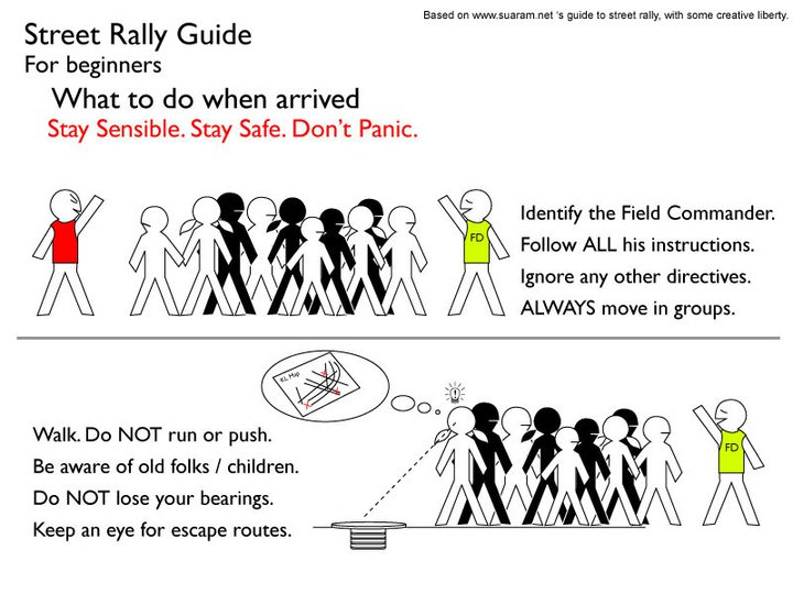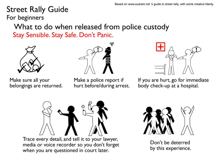 A Malaysian friend of mine caught glance of a great piece of social media flutter today on Facebook that is just begging to be posted here. Suaram, a human rights organization in Malaysia, has published a ‘Street Rally Guide For Beginners’ just in time for the much-trumpeted Bersih 3.0 sit-in protest planned for Merdeka Square this Saturday.