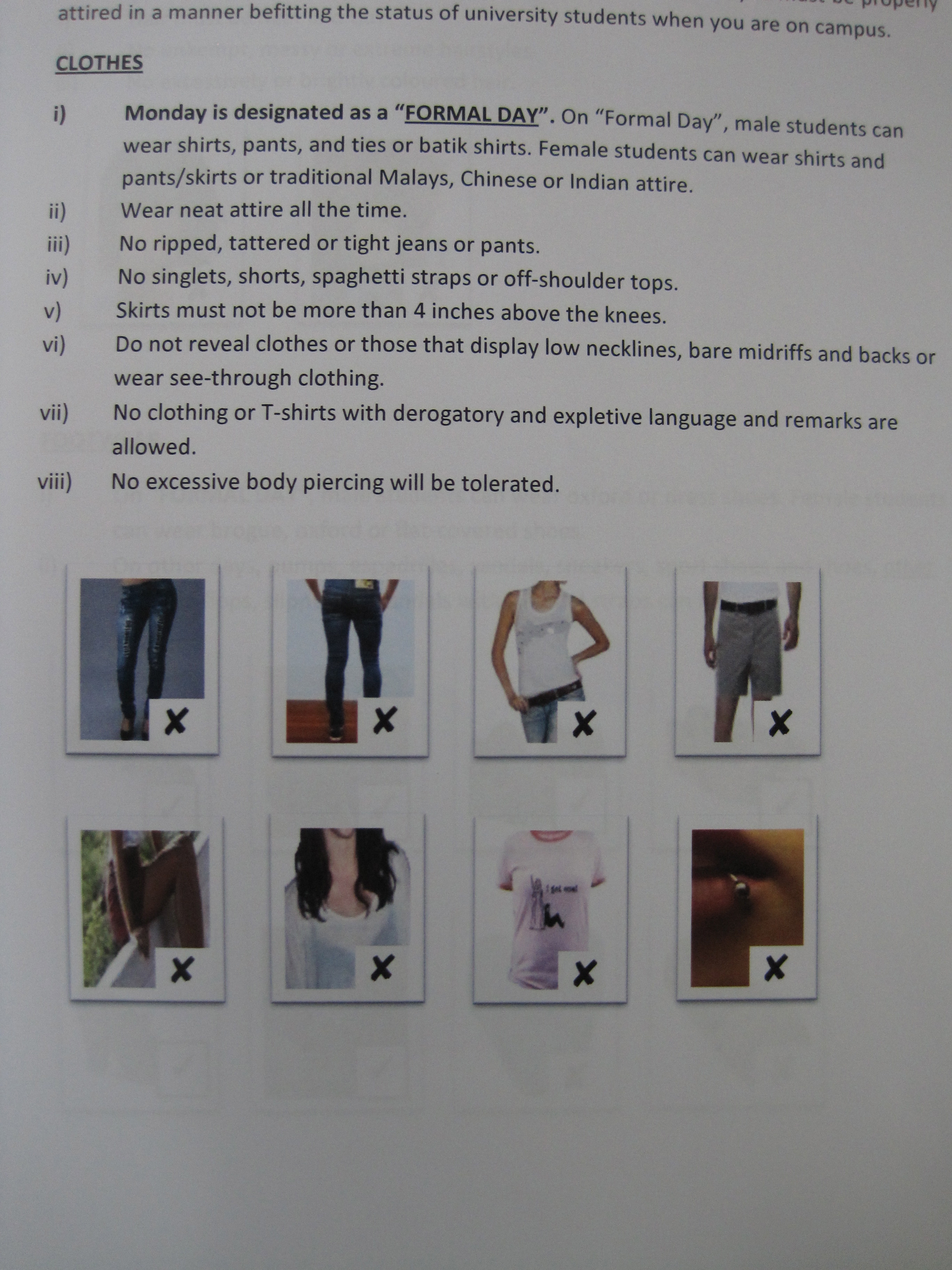 The rules of Formal Monday instantly struck me as being directly juxtaposed to what schools and offices in the US would encourage: Casual Fridays. You can pretty much flip any inherent norm attributed to an American Casual Friday, and you’d have yourself a pretty well outlined “Formal Monday” in Malaysia. As shown above, anything resembling “casual” dress is forbidden, and subsequently punishable by formal (there is that word again) warnings and “one-on-one advice.” Reeducation, after all, can be a facet of education.