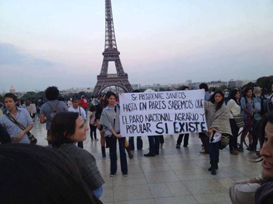 In spirited reaction to the president’s failure to acknowledge the rising tide of discontent in his country, Colombian social media users have been twisting the president’s gaffe into various memes. Former President Uribe’s attempt to side with the strikes have incensed protesters further, who mark him down as part of the problem. Another picture that has been making rounds online depicts two women with a large sign in front of the Eiffel Tower, calling out to “Senor Santos” to inform him that they know of the protest’s existence, even in France.