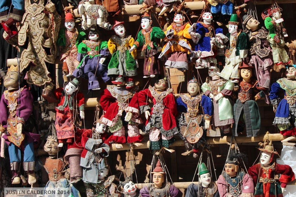 Traditional Myanmar puppets are displayed for sale in Bagan