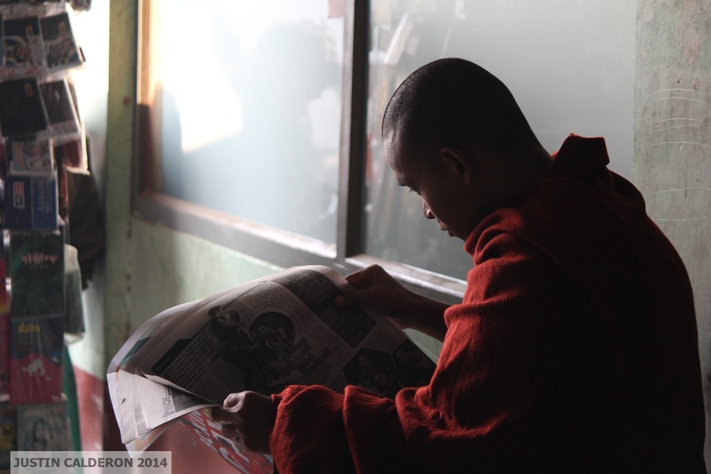 A monk reads the sports section of a newspaper at the Mandalay bus stop