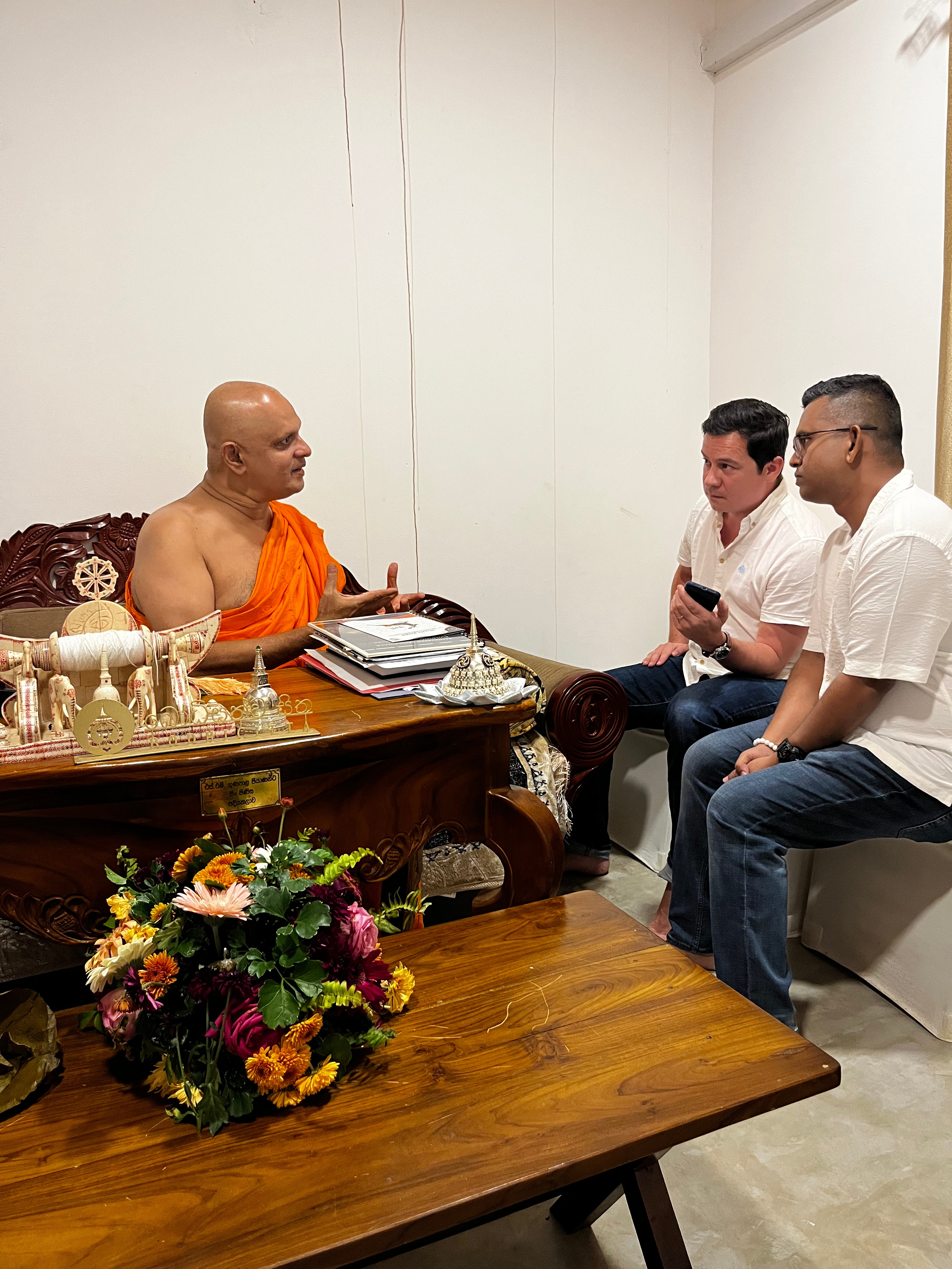 Eetalawetunwawe Gnanathilaka Thero speaks with Justin Calderon at Ruwanwelisaya in Anuradhapura.